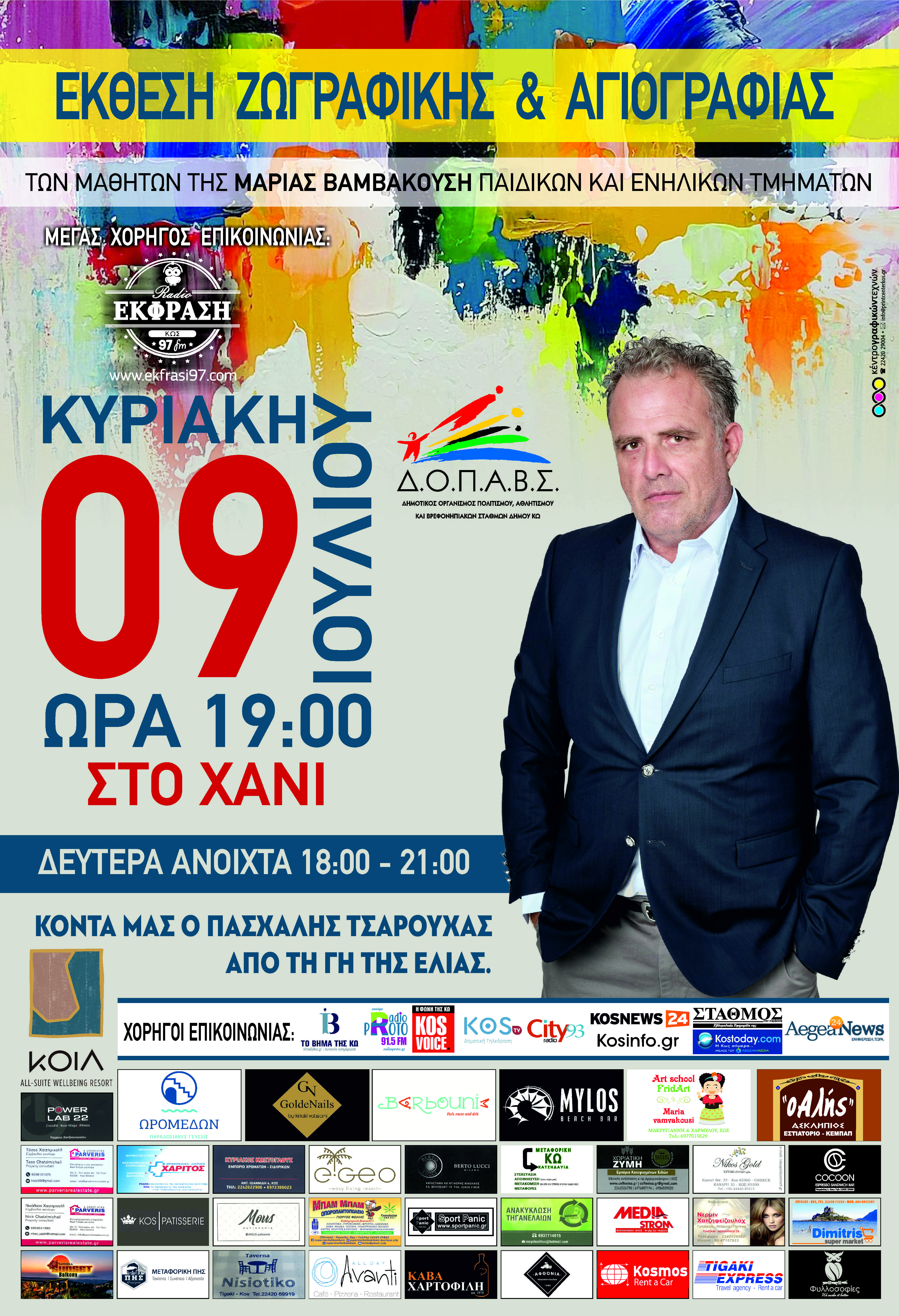 Τα εγκαίνια της έκθεσης θα γίνουν την Κυριακή 9 Ιουλίου στις 7 το βραδύ παρουσία του δημοφιλούς ηθοποιού από τη Γη της Ελιάς Πασχάλη Τσαρούχα.