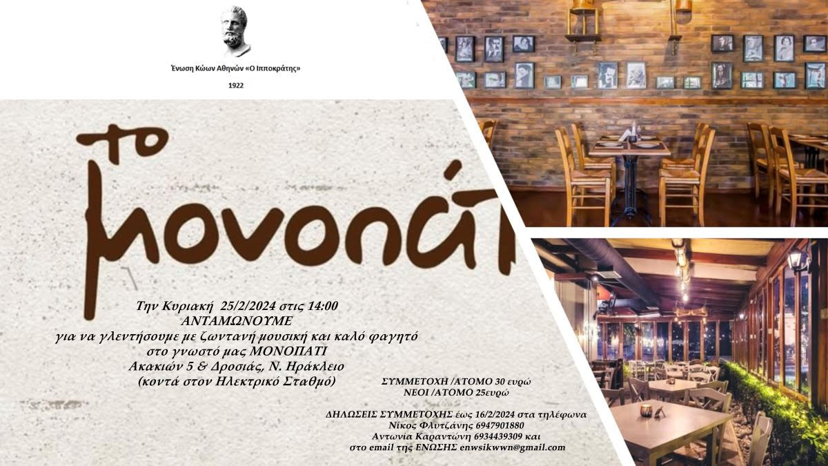 Γλέντι με ζωντανή μουσική και καλό φαγητό, από την Ένωση Κώων Αθηνών «Ο Ιπποκράτης», την Κυριακή 25 Φεβρουαρίου στο εστιατόριο «Μονοπάτι» στο Νέο Ηράκλειο Αττικής.