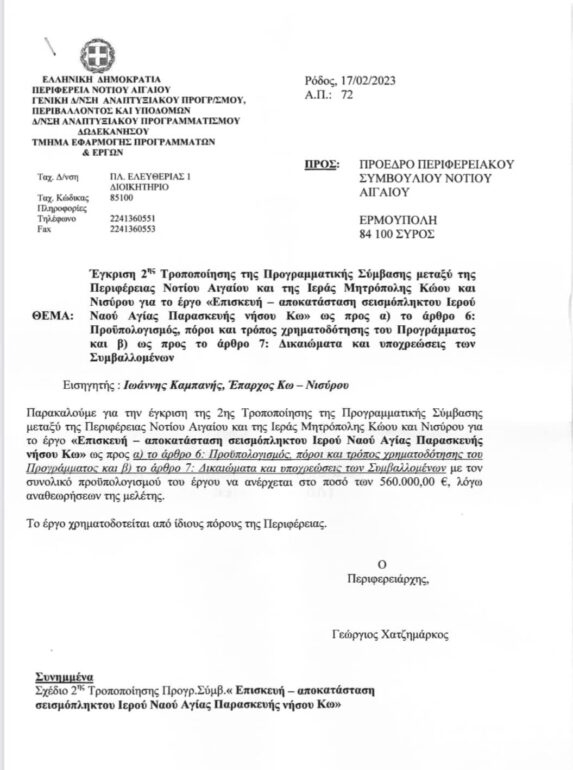 Κατά τη διάρκεια του Περιφερειακού Συμβουλίου που διεξήχθη τη Δευτέρα 20 Φεβρουαρίου στη Σύρο εισηγήθηκα την έγκριση της Επισκευής – αποκατάστασης του σεισμόπληκτου Ιερού Ναού Αγίας Παρασκευής νήσου Κω» με τον συνολικό προϋπολογισμό του έργου να ανέρχεται στο ποσό των 560.000,00 €, λόγω αναθεωρήσεων της μελέτης.