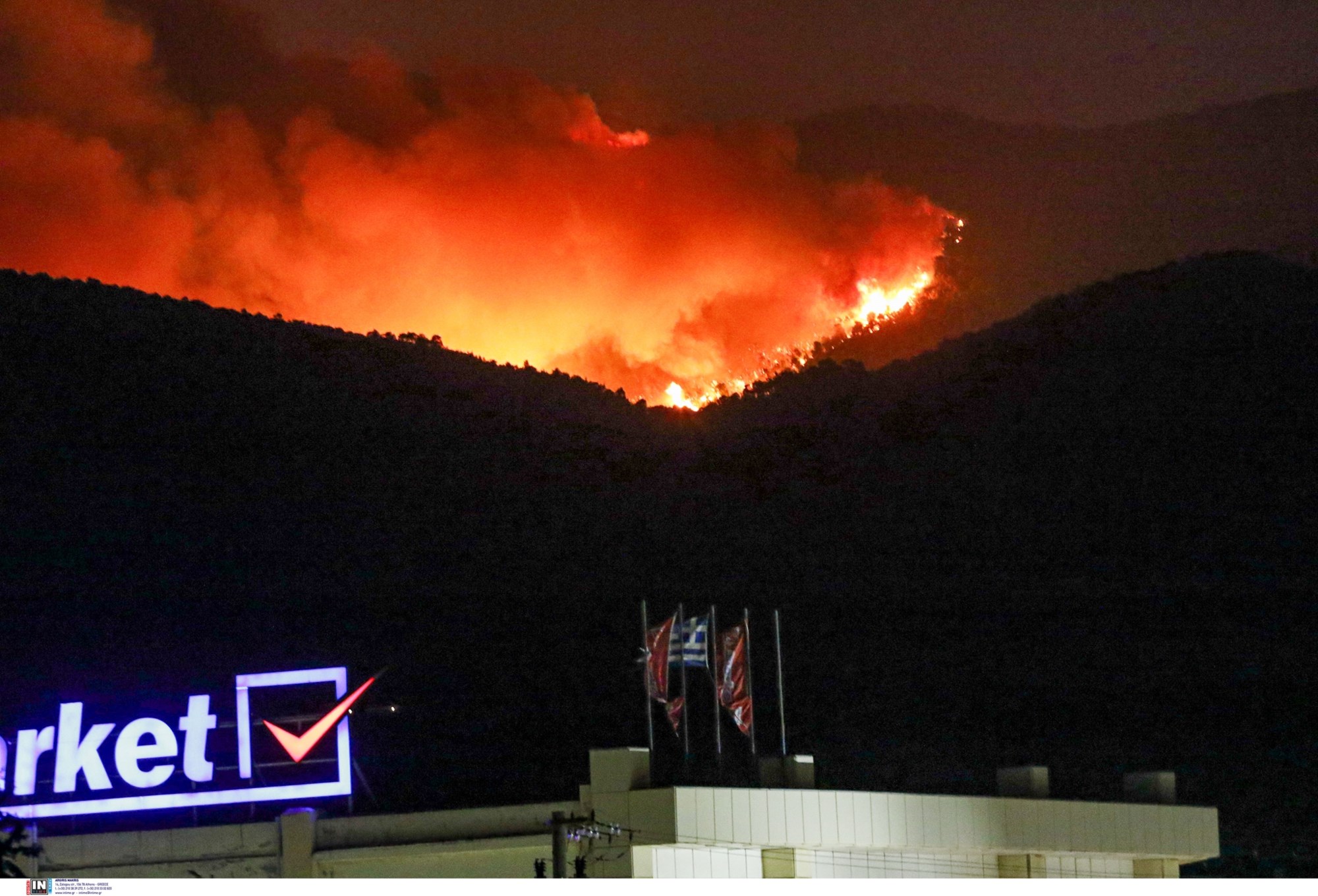 Οι άνεμοι δεν έχουν κοπάσει, κάποιες ριπές είναι ικανές να φουντώσουν τις πύρινες γλώσσες και να δυναμώσουν το μέτωπο, το οποίο κινείται ανεξέλεγκτο. Είναι ενεργό, καίει πάνω στο βουνό και η ελπίδα είναι να μην κατευθυνθεί στην Πάρνηθα. Οι πυροσβεστικές δυνάμεις περιμένουν να βοηθήσει λίγο και ο άνεμος ώστε να αποφευχθεί το χειρότερο δυνατό σενάριο.