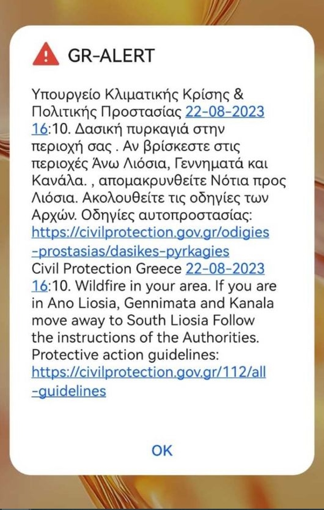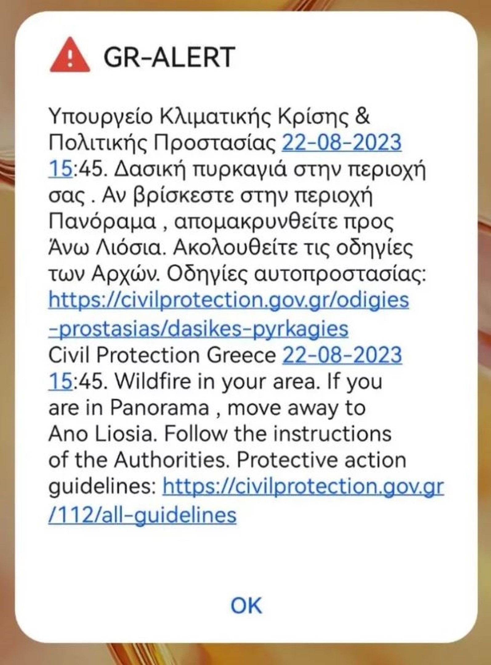 Λίγο νωρίτερα είχαν σταλεί μηνύματα εκκένωσης 112 προς Άνω Λιόσια για όσους βρίσκονται σε Φυλή και Πανόραμα. Η Τροχαία διέκοψε την κυκλοφορία στη Λεωφ. Φυλής.