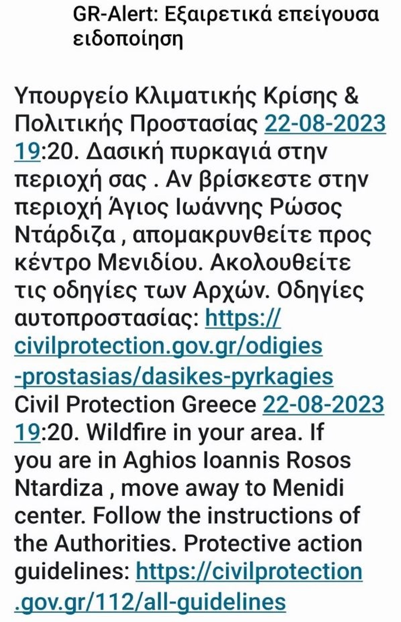 Νωρίτερα, το 112 με νέο μήνυμά του, ειδοποίησε τους κατοίκους που βρίσκονται στην περιοχή Άγιος Ιωάννης Ρώσος – Ντάρδιζατους, να απομακρυνθούν προς Μενίδι.