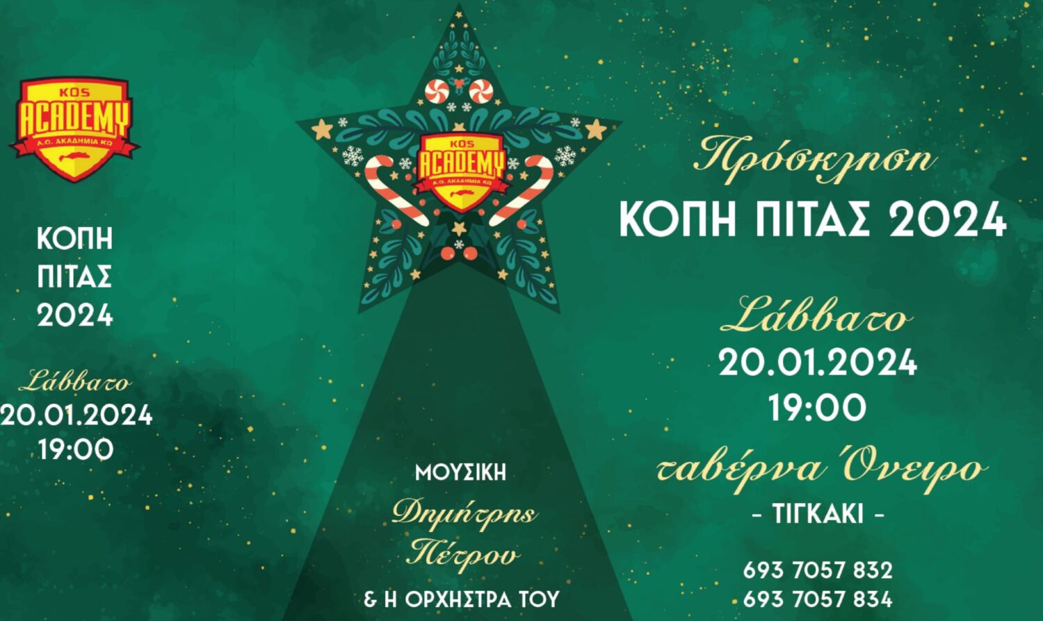 Την πρωτοχρονιάτικη του βασιλόπιτα θα κόψει ο Αθλητικός Όμιλος Ακαδημία Κω με τη διοργάνωση μίας όμορφης χοροεσπερίδας, το Σάββατο 20 Ιανουαρίου στις 19:00, στο εστιατόριο ΌΝΕΙΡΟ στο Τιγκάκι.