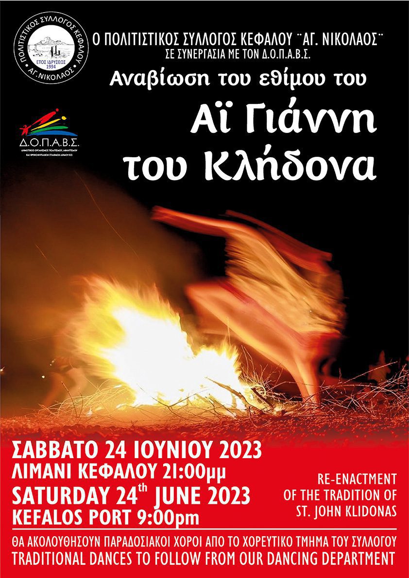 Ο Πολιτιστικός Σύλλογος Κεφάλου «Άγιος Νικόλαος» με την στήριξη του ΔΟΠΑΒΣ και της Κοινότητας Κέφαλου παρουσιάζει την Αναβίωση του Εθίμου του Αι Γιάννη του Κλήδονα το Σάββατο 24 Ιουνίου 2023 και ώρα 21:00 στο Λιμάνι Κεφάλου .
