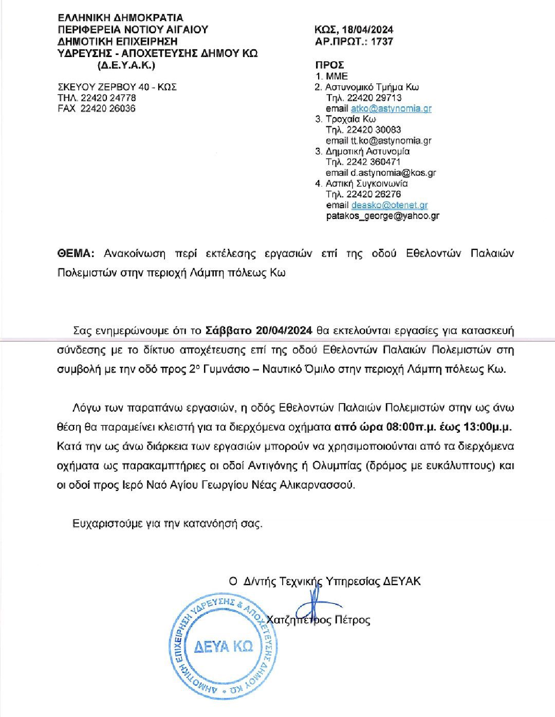 ΑΝΑΚΟΙΝΩΣΗ ΓΙΑ ΕΚΤΕΛΕΣΗ ΕΡΓΑΣΙΩΝ ΣΤΗΝ ΟΔΟ ΕΘΕΛΟΝΤΩΝ ΠΑΛΑΙΩΝ ΠΟΛΕΜΙΣΤΩΝ