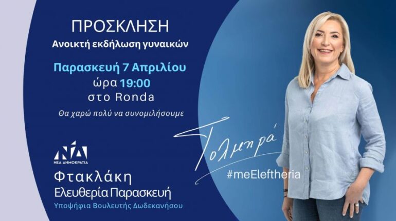 Ανοικτή πολιτική εκδήλωση γυναικών διοργανώνει στη Ρόδο η υποψήφια Βουλευτής Δωδεκανήσου της Νέας Δημοκρατίας, Ελευθερία Φτακλάκη, ενόψει των επικείμενων εθνικών εκλογών.