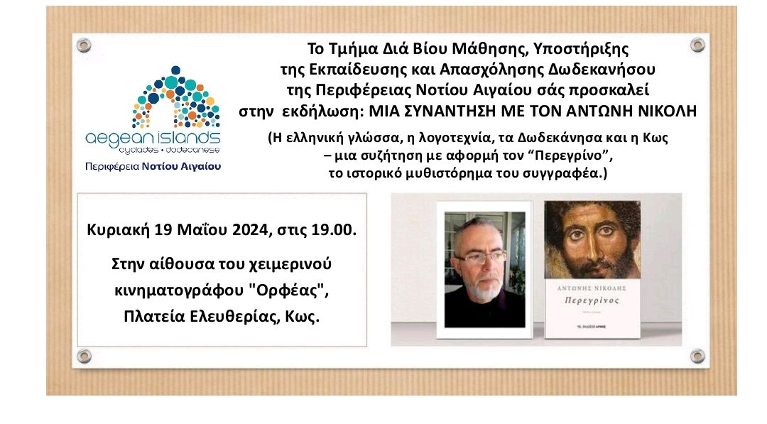 Οι μαθητές του Αντώνη Νικολή, με την ευκαιρία της έκδοσης του «Περεγρίνου», του ιστορικού μυθιστορήματός του, οργανώνουν συνάντηση μαζί του, ανοικτή και στην υπόλοιπη κοινωνία του νησιού. Θα αναφερθεί στα προσφιλή του: ελληνική γλώσσα, λογοτεχνία, Δωδεκάνησα-Κω. Στον χειμερινό κινηματογράφο «Ορφέα», την Κυριακή 19 Μαΐου, στις 19.00.