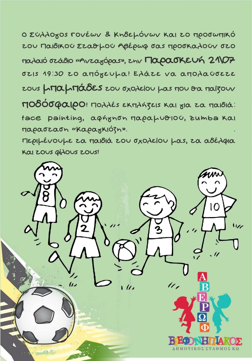 Η ΕΠΙΤΡΟΠΗ ΒΕΤΕΡΑΝΩΝ ΠΟΔΟΣΦΑΙΡΙΣΤΩΝ ΚΑΛΕΙ ΟΛΟΥΣ ΤΟΥΣ ΒΕΤΕΡΑΝΟΥΣ ΠΟΔΟΣΦΑΙΡΙΣΤΕΣ ΤΟΥ ΝΗΣΙΟΥ ΝΑ ΔΩΣΟΥΝ ΤΟ ΠΑΡΩΝ ΣΕ ΦΙΛΙΚΟ ΑΓΩΝΑ ΜΕ ΤΟΥΣ ΓΟΝΕΙΣ ΤΩΝ ΒΡΕΦΟΝΗΠΙΑΚΩΝ ΣΤΑΘΜΩΝ ΤΗΝ ΠΑΡΑΣΚΕΥΗ 21 ΙΟΥΛΙΟΥ ΣΤΟ ΠΑΛΙΟ ΣΤΑΔΙΟ ΑΝΤΑΓΟΡΑΣ! ΕΜΦΑΝΙΣΗ( ΜΠΛΟΥΖΑ ΛΕΥΚΗ) ΣΟΡΤΣ ΜΑΥΡΟ)