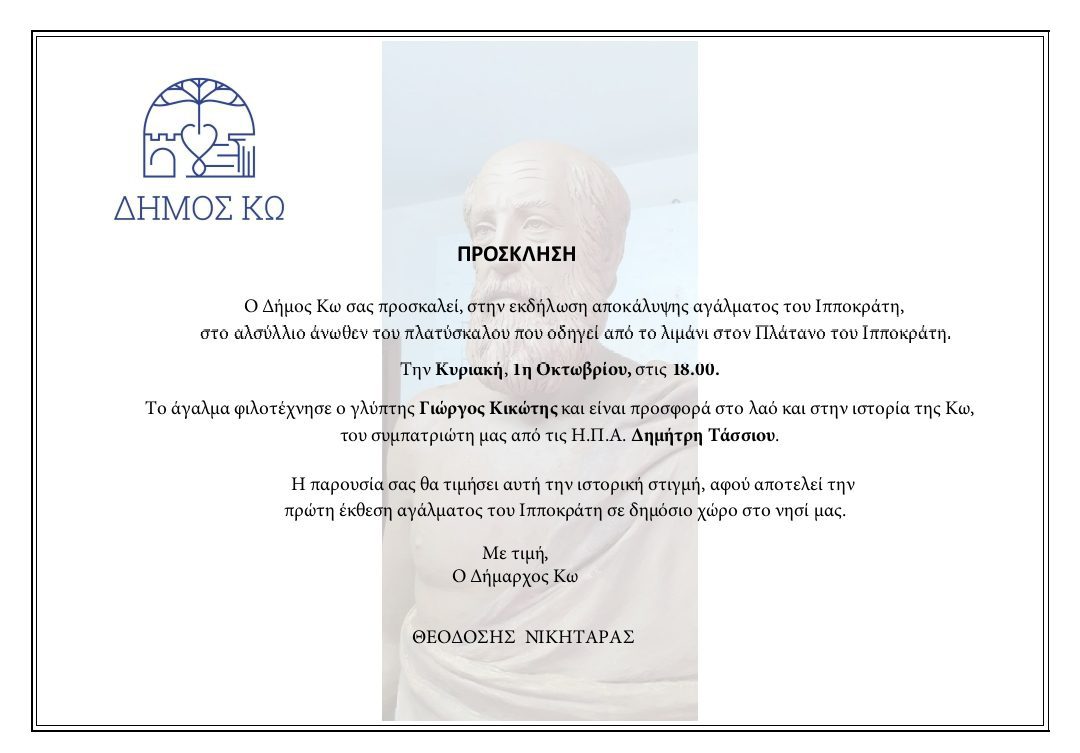 Ιστορικό γεγονός αποτελεί για την Κω η τοποθέτηση αγάλματος του Πατέρα της Ιατρικής επιστήμης Ιπποκράτη, για πρώτη φορά σε δημόσιο χώρο στο νησί μας.