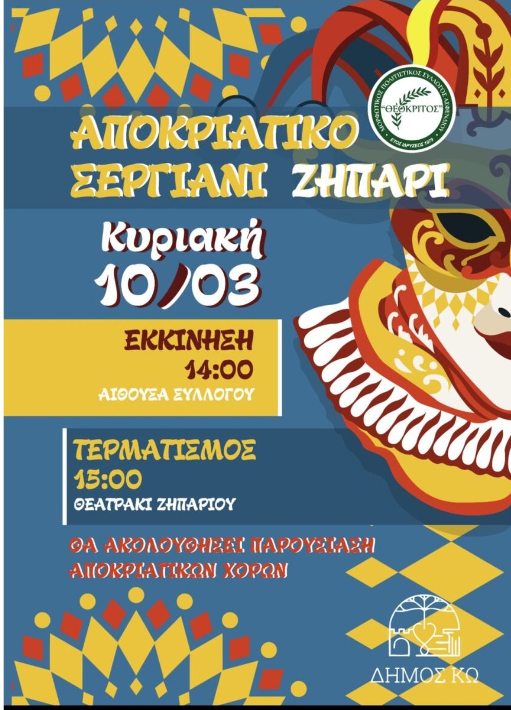 Ο Πολιτιστικός Σύλλογος Ασφενδιού «Ο Θεόκριτος » σε συνεργασία με την Κοινότητα Ασφενδιού και το τμήμα Πολιτισμού του Δήμου Κω διοργανώνουν Αποκριάτικο σεργιάνι στο Ζηπάρι την Κυριακή 10 Μαρτίου στις 14:00 στο Θεατράκι Ζηπαρίου.