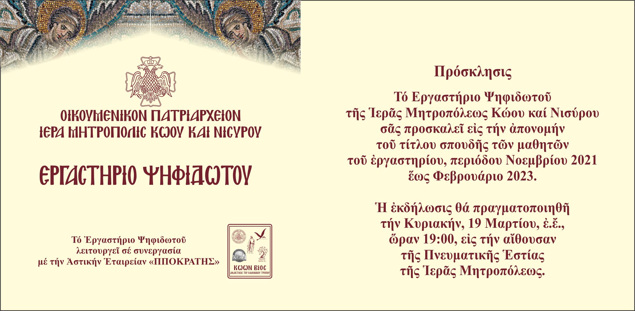 Το Εργαστήριο Ψηφιδωτού της Ιεράς Μητροπόλεως Κώου και Νισύρου, σε συνεργασία με την Αστική Εταιρεία «ΙΠΠΟΚΡΑΤΗΣ», την Κυριακήν, 19 Μαρτίου, εε, ώραν 19:00, εις την αίθουσα της Πνευματικής Εστίας της Ιεράς Μητροπόλεως, απονέμει τον Τίτλο Σπουδής εις τους μαθητές περιόδου Νοεμβρίου 2021 έως Φεβρουάριο 2023.