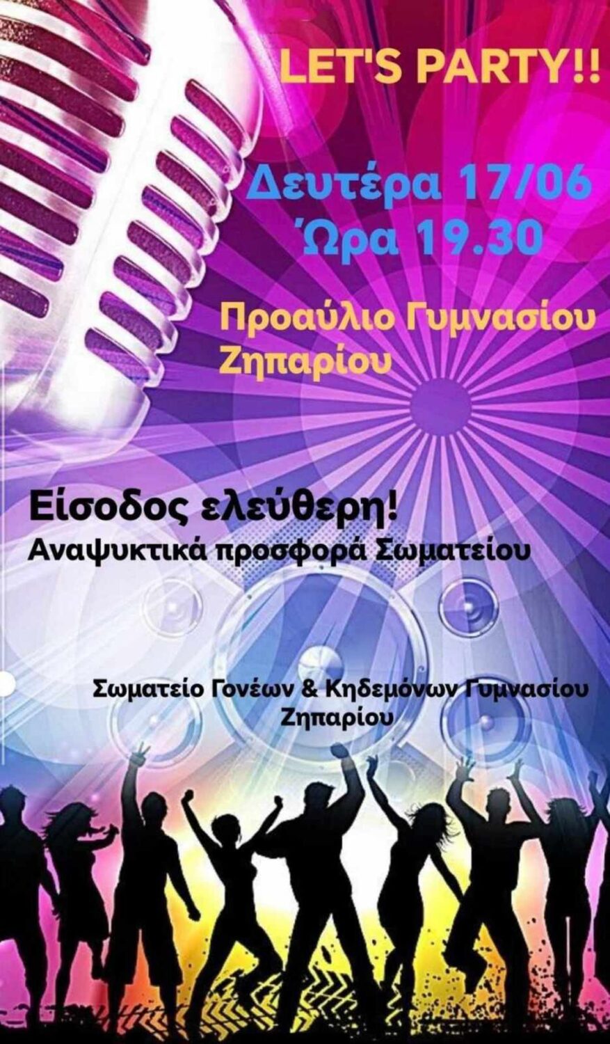 Η Διεύθυνση, οι Καθηγήτριες, οι Καθηγητές , το Σωματείο Γονέων και Κηδεμόνων του Γυμνασίου Ζηπαρίου , προσκαλούν τους γονείς και τους μαθητές του σχολείου μας σε ένα party με μουσική(Dj), χορό, σνακ και μη αλκοολούχα αναψυκτικά προσφορά του Σωματείου την Δευτέρα 17 Ιουνίου 2024 και ώρα 19:30 στον προαύλιο χώρο του σχολείου. Είσοδος ελεύθερη!!