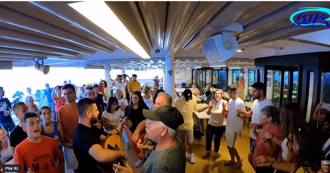Ο Βελισσάριος Αναστάσης στο λαούτο, ο Μανώλης Φράγκος στο βιολί και ο Κυριάκος Μπαϊράμης στο τραγούδι ξεσήκωσαν γρήγορα τους επιβάτες του πλοίου οι οποίοι συνέρρεαν στον τόπο του κεφιού και δεν άργησαν να συνοδεύσουν με παλαμάκια, χορό και τραγούδι! Όσο για τον Ταξιάρχη και τον Μιχάλη, αυτοί έκλεψαν την παράσταση με τις χορευτικές φιγούρες τους!