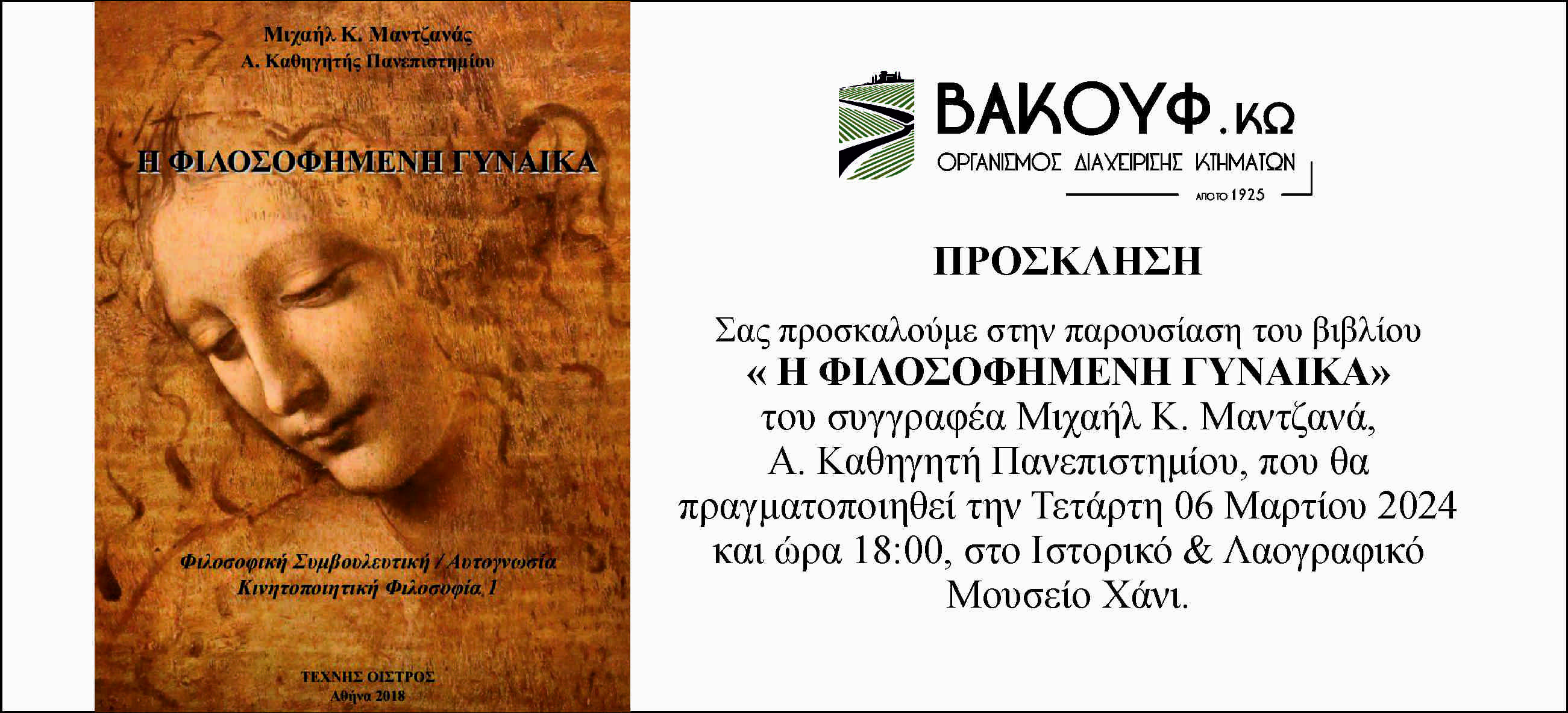 Share Facebook Twitter LinkedIn Pinterest Email Σας προσκαλούμε στην παρουσίαση του βιβλίου « Η ΦΙΛΟΣΟΦΗΜΕΝΗ ΓΥΝΑΙΚΑ » του συγγραφέα Μιχαήλ κ. Μαντζανά, Α. Καθηγητή Πανεπιστημίου, που θα πραγματοποιηθεί την Τετάρτη 06 Μαρτίου 2024 και ώρα 18:00, στο Ιστορικό & Λαογραφικό Μουσείο Χάνι ΒΑΚΟΥΦ Κω