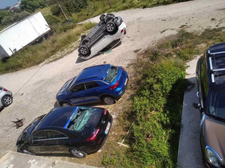 Όπως φαίνεται χαρακτηριστικά στις σχετικές φωτογραφίες, αναποδογύρισαν και βανδάλισαν οχήματα, σπάζοντας τζάμια και προκαλώντας ζημιές χιλιάδων ευρώ.