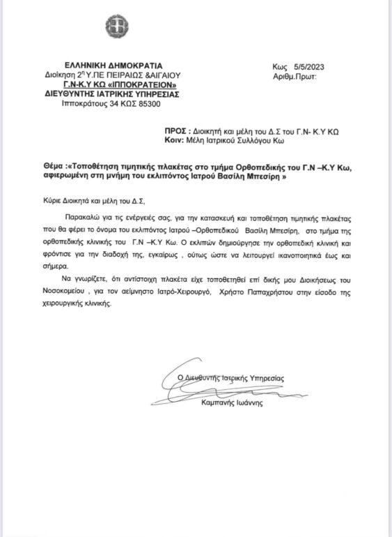 Αναγκάζομαι να σας αποστείλω το έγγραφο αυτό, διότι έως και σήμερα δεν έχει αποσταλεί από τη γραμματεία της Διοίκησης του Νοσοκομείου Κω στους αποδέκτες που αναφέρονται.
