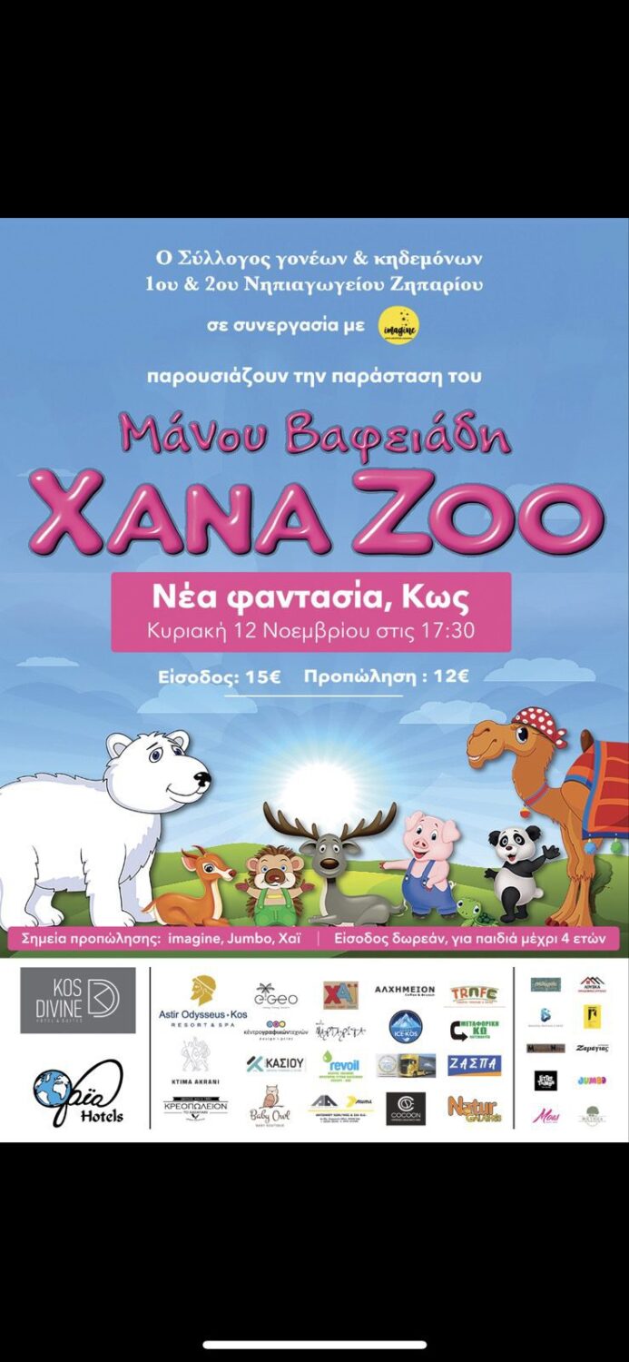 Ο Σύλλογος Γονέων και Κηδεμόνων 1ου και 2ου Νηπιαγωγείου Ζηπαρίου, σε συνεργασία με το Κέντρο δημιουργικής απασχόλησης παιδιών Imagine, είναι στην ευχάριστη θέση να καλωσόρισει για πρώτη φορά στο νησί μας την παιδική σκηνή του Χρήστου Τριπόδη και την Εταιρεία Μέθεξις, σε παρουσία της παιδικής παράστασης “ΧΑΝΑ ΖΟΟ”.