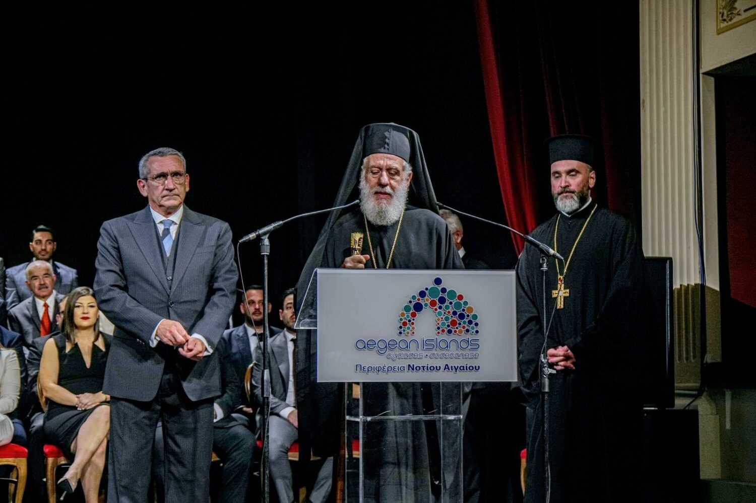 Παρόντες στην τελετή ήταν ο αναπληρωτής Yπουργός Εσωτερικών Θεόδωρος Λιβάνιος, ο Yφυπουργός Ναυτιλίας και Νησιωτικής Πολιτικής, Γιάννης Παππάς, η βουλευτής Κυκλάδων, Κατερίνα Μονογυιού, η Ειδ. Γραμματέας Αποκεντρωμένης Διοίκησης Αιγαίου, Μαριάννα Νικολαΐδου, ο νεοεκλεγείς Περιφερειάρχης Αττικής και τέως Υπουργός, Νίκος Χαρδαλιάς, ο απερχόμενος Δήμαρχος Σύρου – Ερμούπολης, Νίκος Λειβαδάρας, οι νεοεκλεγέντες Δήμαρχοι, Σύρου – Ερμούπολης, Αλέξανδρος Αθανασίου, Ρόδου, Αλέξανδρος Κολιάδης, Λέρου, Τιμόθεος Κωττάκης, Τήνου, Παναγιώτης Κροντηράς, Πάτμου, Νικήτας Τσαμπαλάκης, οι απερχόμενοι Δήμαρχοι, Άνδρου, Δημήτρης Λοτσάρης και Μυκόνου, Κωνσταντίνος Κουκάς, οι Πρόεδροι των Επιμελητηρίων Δωδεκανήσου και Κυκλάδων, Γιάννης Πάππου και Γιάννης Ρούσσος αντίστοιχα και εκπρόσωποι τοπικών φορέων και συλλογικοτήτων.