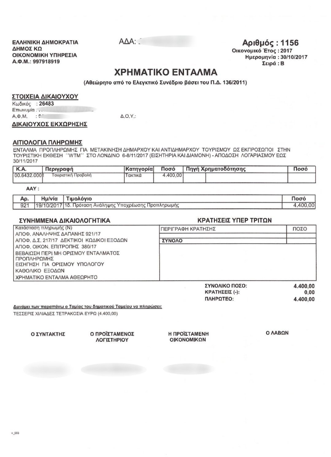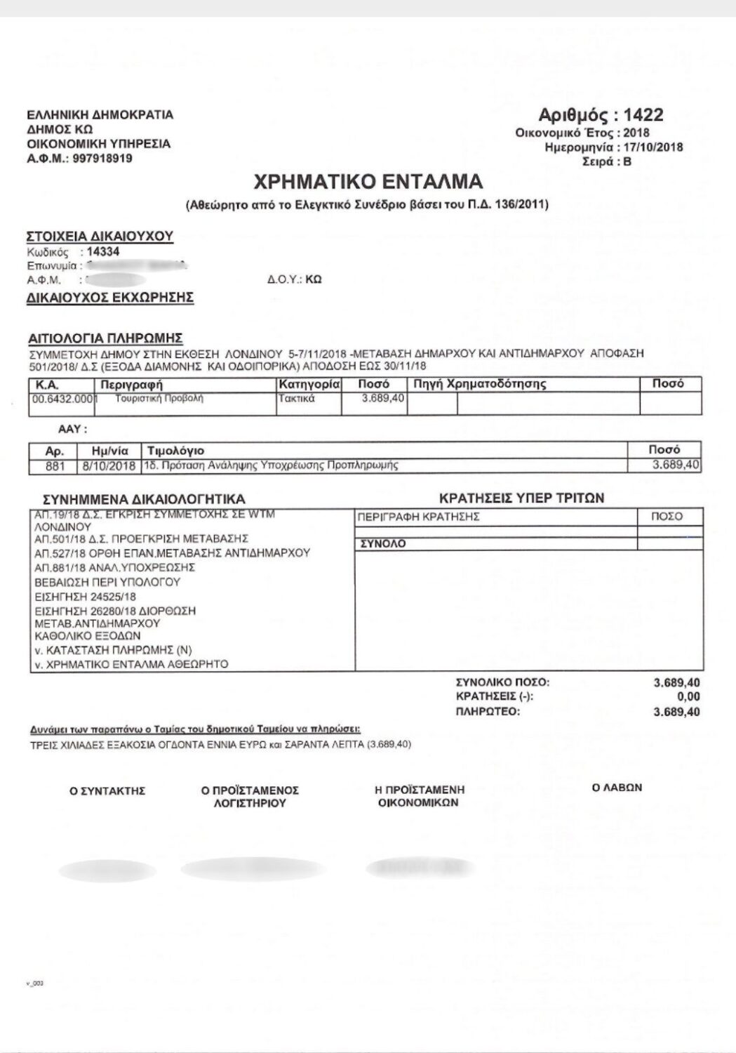 Σημείωση: Αναγκαζόμαστε να δώσουμε στη δημοσιότητα έγγραφα και εντάλματα για τα έξοδα των κ.κ. Σιφάκη και Κυρίτση στο Λονδίνο, τα έτη 2017 και 2018, για να αντιληφθούν οι συμπολίτες μας ότι οι συγκεκριμένες δαπάνες είναι ακριβώς ίδιες με αυτές της Αντιδημάρχου κας Βλάχου, αφού έτσι προβλέπεται από το θεσμικό πλαίσιο.