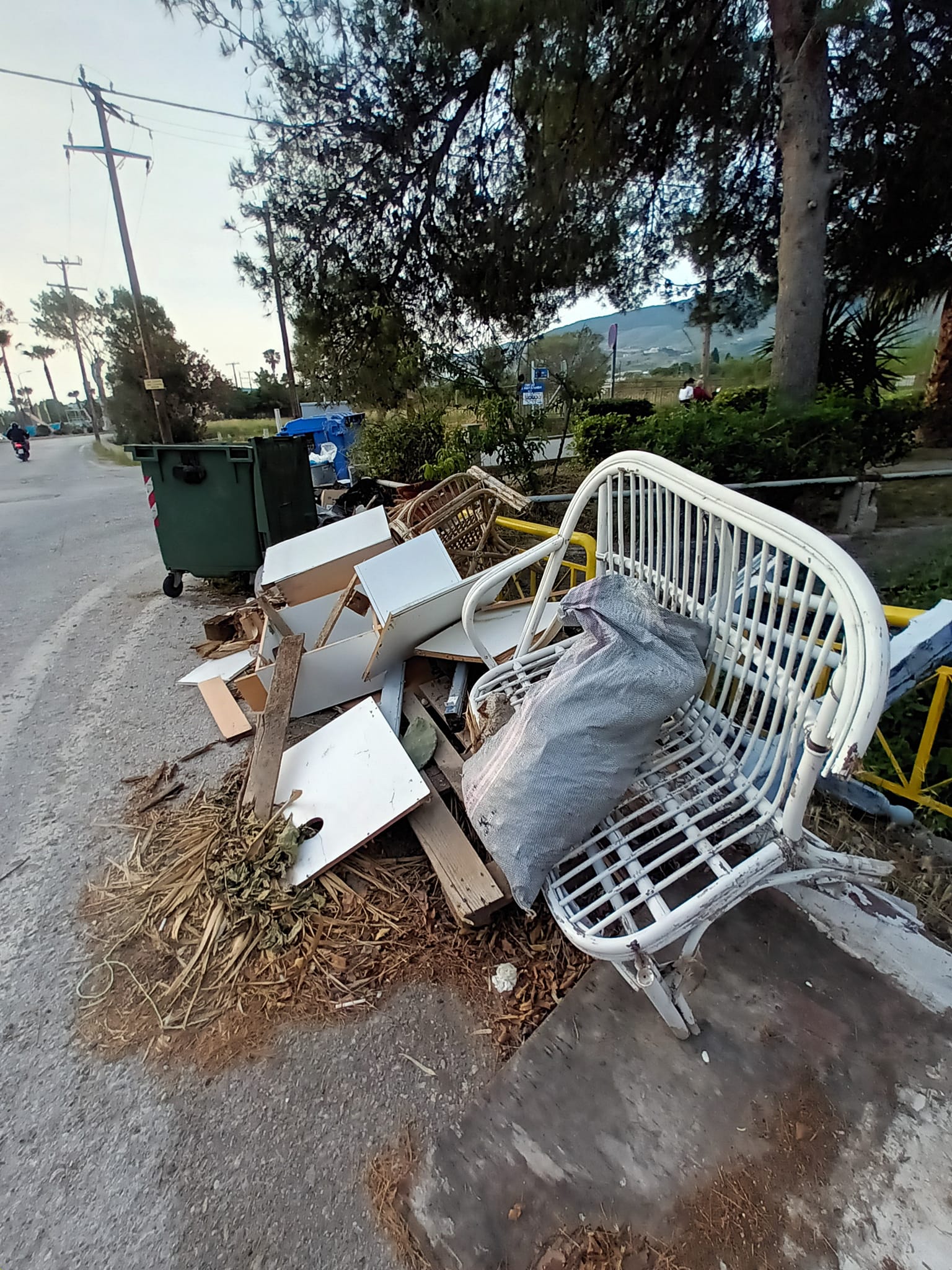 Όμως, δεν είναι μόνο αυτό. Κατά την διαδρομή παρατήρησα και φωτογράφισα σκουπίδια, τραπέζια σπασμενα, καρέκλες ξεχαρβαλλωμενες, κορμοι δένδρων, κλώνοι από κλαδέματα, πορτοπαραθυρα άτακτα, και, χωρίς ντροπή πεταμένα.