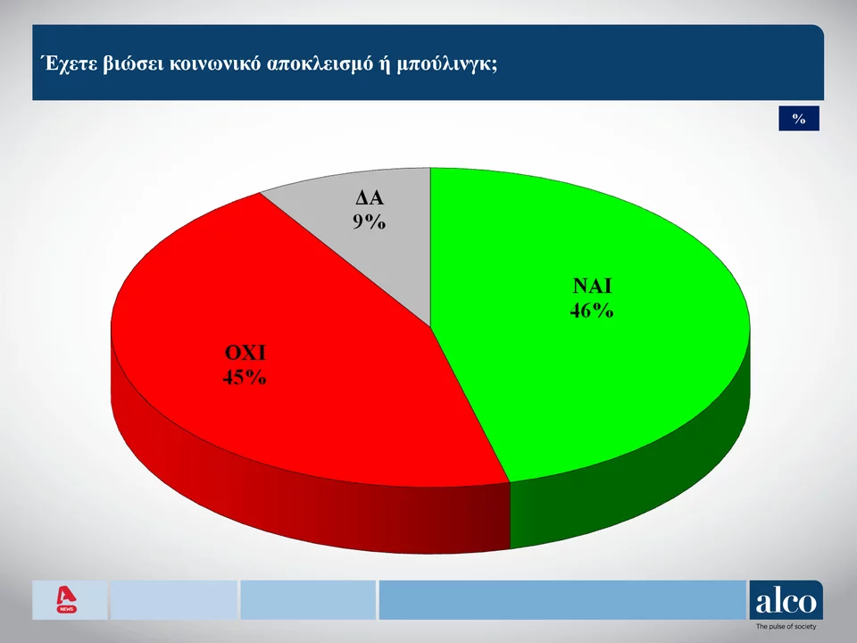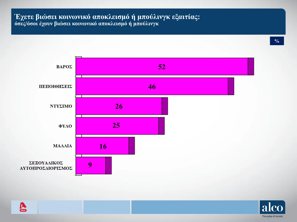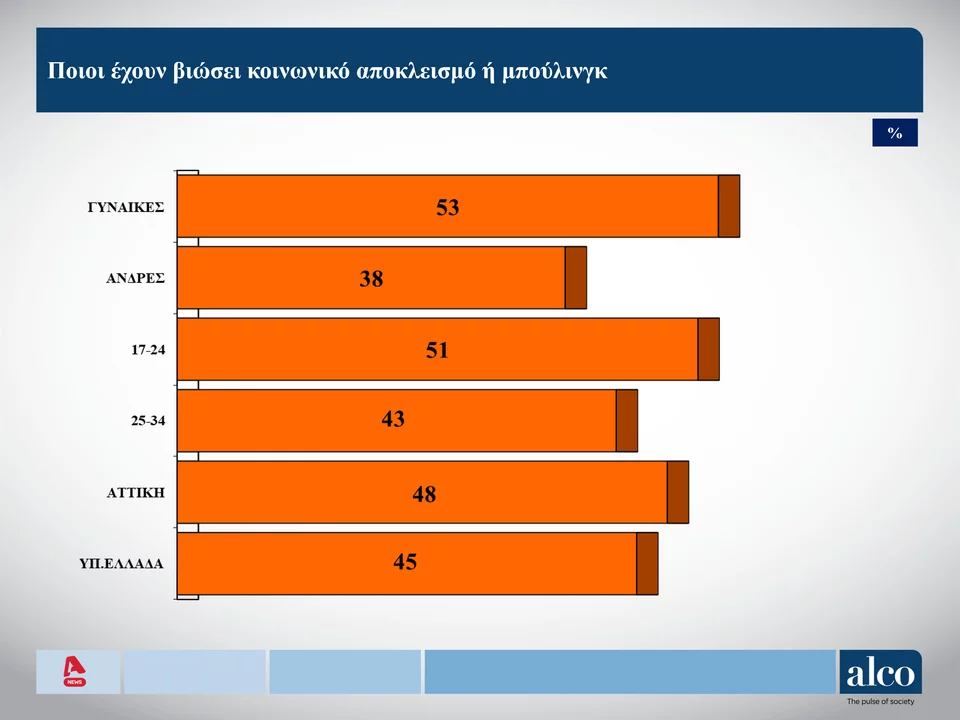 Από όσους έχουν δεχθεί bullying και κοινωνικό αποκλεισμό, το 53% είναι γυναίκες και το 38% άνδρες.