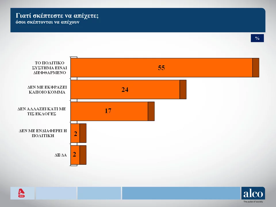 Σε όσους είπαν ότι θα απέχουν από τις εκλογές, το 55% απάντησε ότι δεν θα ψηφίσει επειδή «το πολιτικό σύστημα είναι διεφθαρμένο», το 24% διότι «δεν με εκφράζει κάποιο κόμμα», 17% «δεν αλλάζει κάτι με τις εκλογές», ενώ το 2% απάντησε πως δεν το ενδιαφέρει η πολιτική.
