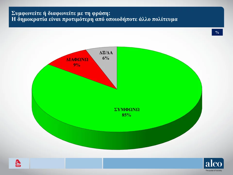 Στη φράση «η δημοκρατία είναι προτιμότερη από οποιοδήποτε άλλο πολίτευμα», το συντριπτικό ποσοστό του 85% απάντησε θετικά, το 9% αρνητικά και το 6% «ΔΞ/ΔΑ».