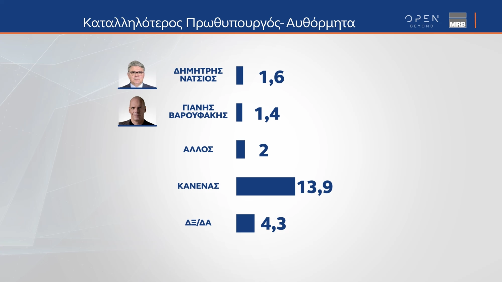 Καταλληλότερος για πρωθυπουργός εμφανίζεται ο Κυριάκος Μητσοτάκης με 44,7%, ενώ ακολουθεί ο Αλέξης Τσίπρας με 13,1%, ο Νίκος Ανδρουλάκης με 6,5%, η Ζωή Κωνσταντοπούλου με 4,6%, ο Δημήτρης Κουτσούμπας με 4,3% και ο Κυριάκος Βελόπουλος με 3,6%.