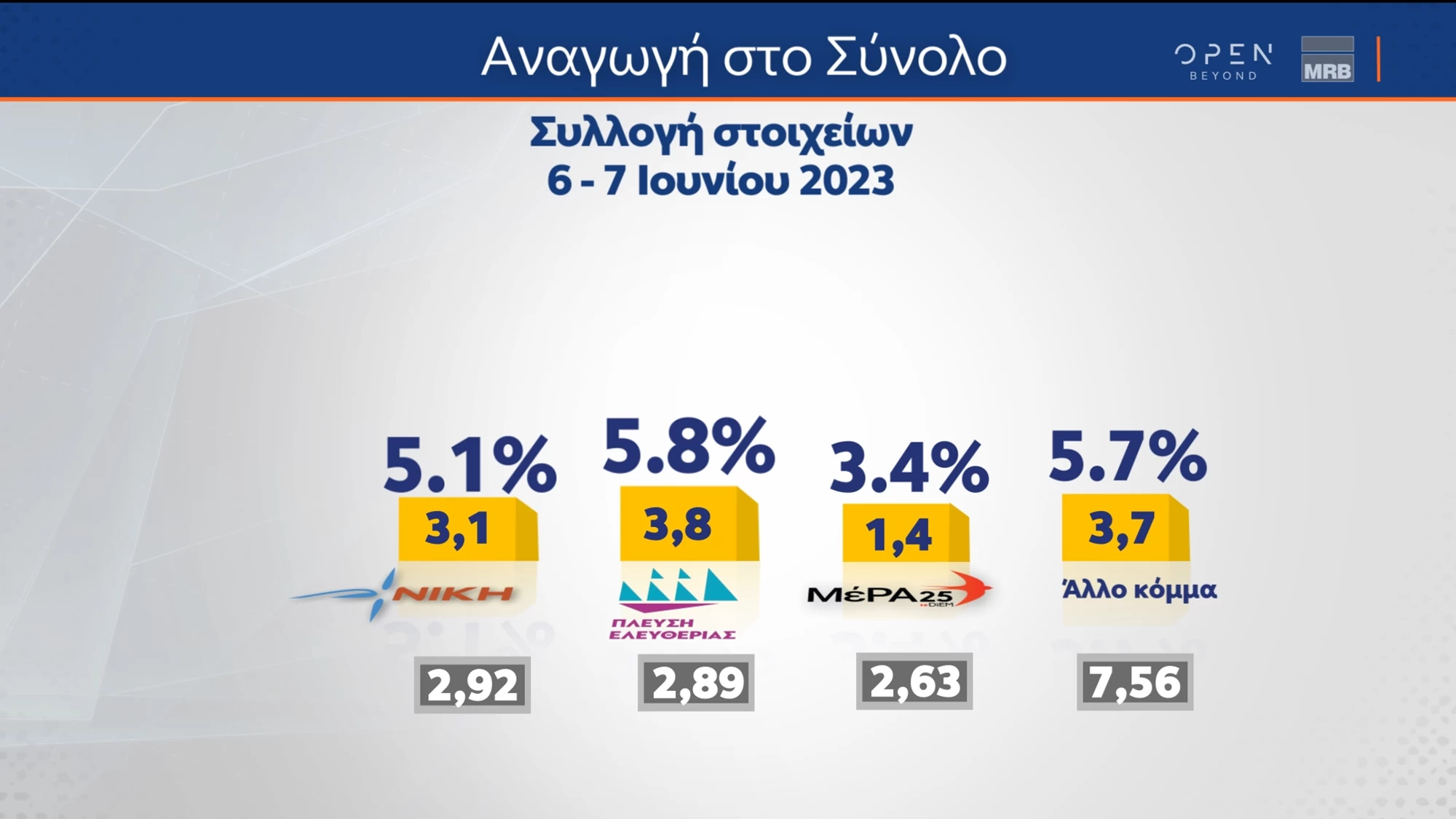 Ευρύ προβάδισμα και αυτοδύναμη κυβέρνηση για τη ΝΔ δίνει η δημοσκόπηση της MRB, για το κεντρικό δελτίο ειδήσεων του Open, ενόψει των εκλογών 2023 της 25ης Ιουνίου.