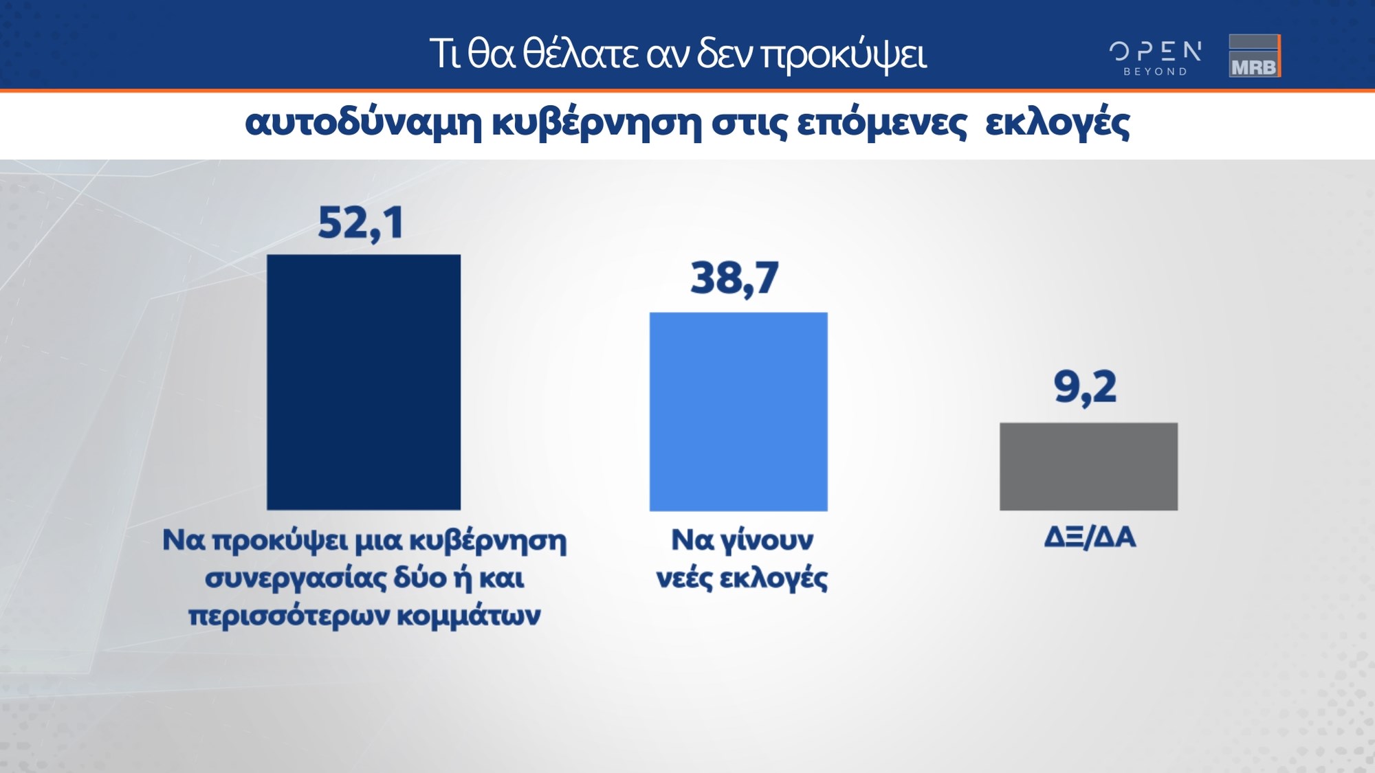 Σε περίπτωση που δεν επιτευχθεί αυτοδυναμία στις 25 Ιουνίου, το 52,1% θέλει να προκύψει κυβέρνηση συνεργασίας, ενώ το 38,7% θέλει νέα προσφυγή στις κάλπες.