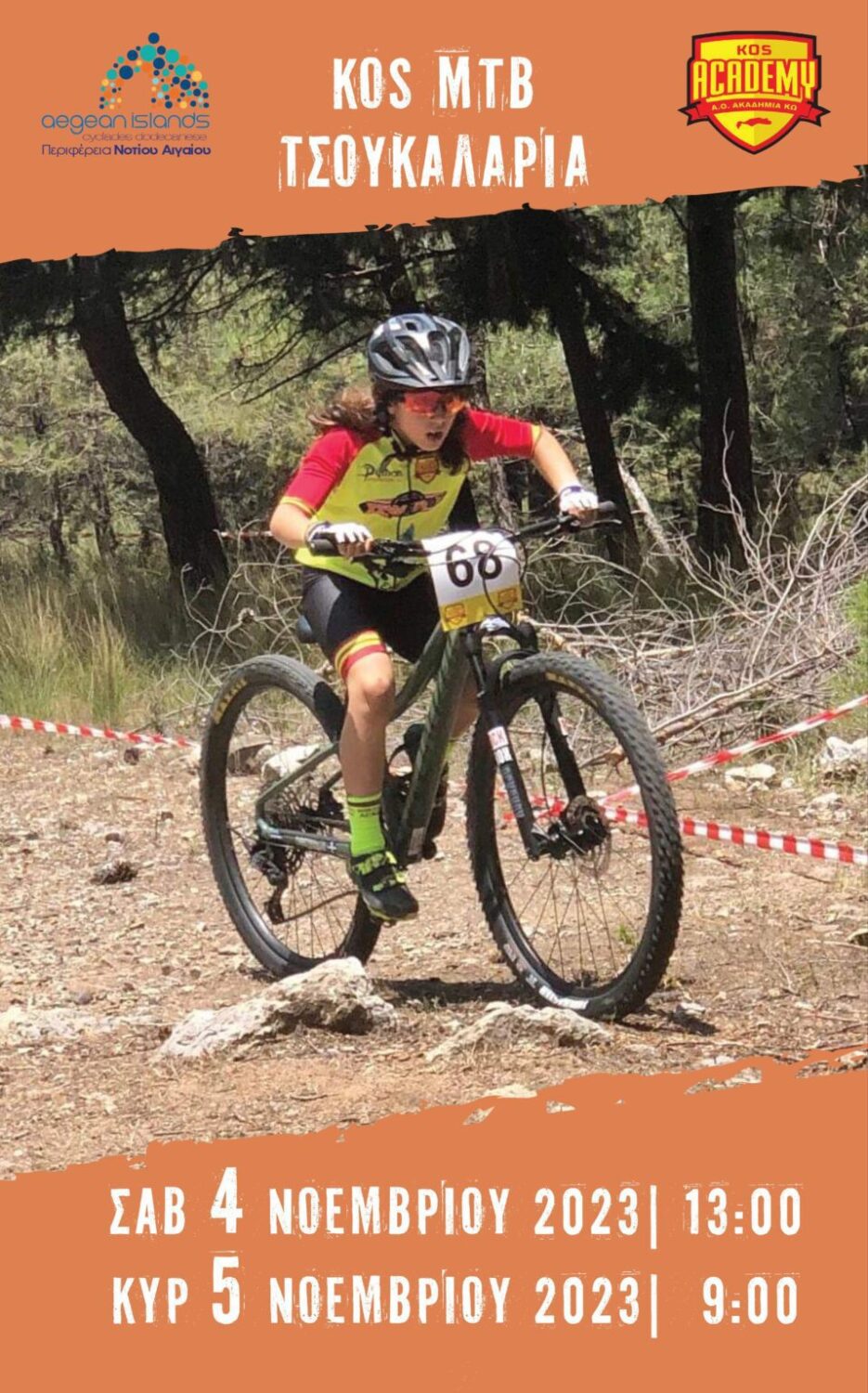 Ο Αθλητικός Όμιλος Ακαδημία Κω, το Σάββατο 4 και την Κυριακή 5 Νοεμβρίου, διοργανώνει τον διασυλλογικό αγώνα ορεινής ποδηλασίας «KOS MTB#2 – 2023», με τη στήριξη της Περιφέρειας Νοτίου Αιγαίου, στην περιοχή της Παναγιάς Τσουκαλαριάς, για τις αγωνιστικές κατηγορίες των Ανδρών, Εφήβων, Νεανίδων, Παίδων, Κορασίδων, Παμπαίδων, Παγκορασίδων, Μίνι και Super Μίνι.