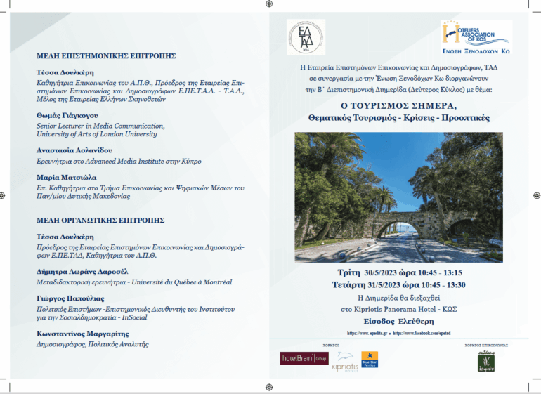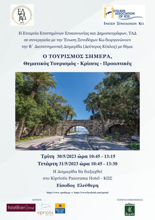 Η Εταιρεία Επιστημόνων Επικοινωνίας και Δημοσιογράφων, Τ.Α.Δ., διοργανώνει στις 30 και 31 Μαΐου στην Κω σε συνεργασία με την Ένωση Ξενοδόχων Κω τη διεπιστημονική διημερίδα με θέμα: «O ΤΟΥΡΙΣΜΟΣ ΣΗΜΕΡΑ: Θεματικός Τουρισμός, Κρίσεις, Προοπτικές». Οι εργασίες της διημερίδας θα φιλοξενηθούν στο ξενοδοχείο Kipriotis Panorama Hotel.