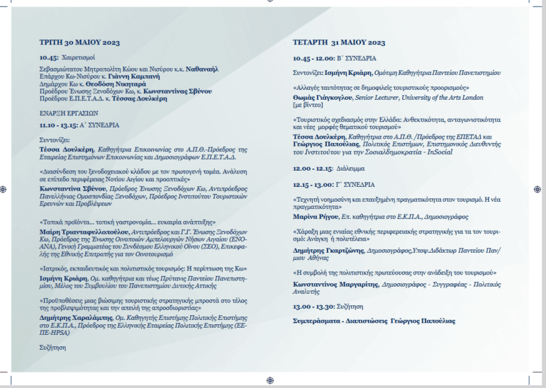 : Ανθεκτικότητα, ανταγωνιστικότητα και νέες μορφές θεματικού τουρισμού», την τέως Πρύτανη του Παντείου Πανεπιστημίου Ισμήνη Κριάρη, με θέμα «Πολιτιστικός – εκπαιδευτικός, Ιατρικός Τουρισμός/ Η περίπτωση στη Κω», τον ομότιμο καθηγητή του Ε.Κ.Π.Α., Πρόεδρο της Ελληνικής Εταιρείας Πολιτικής Επιστήμης (ΕΕΠΕ – HPSA), Δημήτρη Χαραλάμπη, με θέμα: