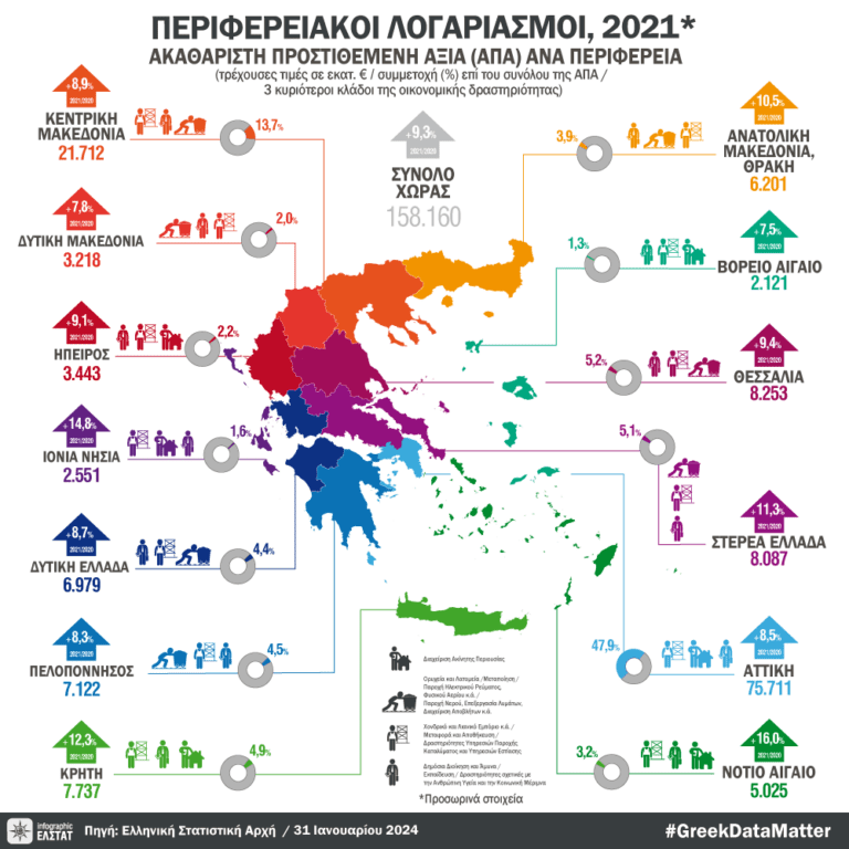 Σύμφωνα επίσης με τους περιφερειακούς λογαριασμούς της ΕΛΣΤΑΤ, το 2021 η Ακαθάριστη Προστιθέμενη Αξία (ΑΠΑ) αυξήθηκε 9,3% στο σύνολο της χώρας.