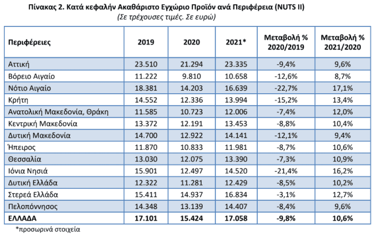 Αύξηση 10,6% σημείωσε το κατά κεφαλήν περιφερειακό ΑΕΠ στο σύνολο της χώρας (υπολογιζόμενος πληθυσμός στο μέσο του έτους) το 2021 σε σχέση με το 2020 και ανήλθε σε 17.058 ευρώ.