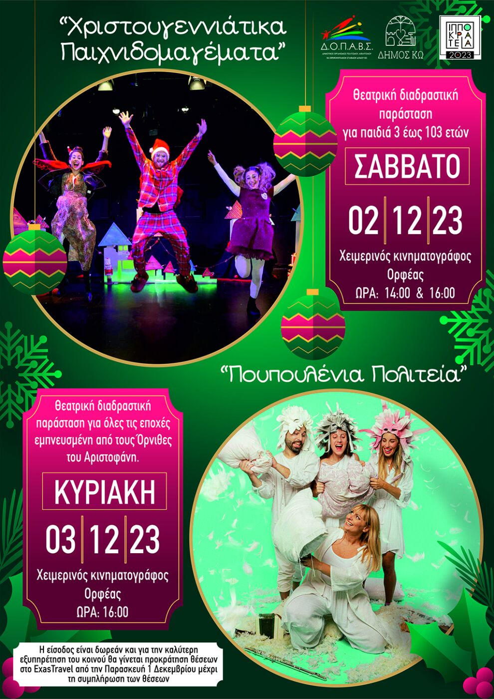 Στο πλαίσιο των χριστουγεννιάτικων εκδηλώσεων 2023 ο ΔΟΠΑΒΣ και Η Ομάδα των Πέντε Εποχών διοργανώνουν διήμερο εκδηλώσεων για παιδιά: ‘’Χριστουγεννιάτικα Παιχνιδομαγέματα’’ θεατρική διαδραστική παράσταση σε δραματουργία και σκηνοθεσία Σοφίας Παπαδοπούλου το Σάββατο 2 Δεκεμβρίου στις 2 το μεσημέρι και στις 4 το απόγευμα στον Χειμερινό Κινηματογράφο Ορφέα με δωρεάν είσοδο και προκράτηση θέσεων στο EXAS TRAVEL.