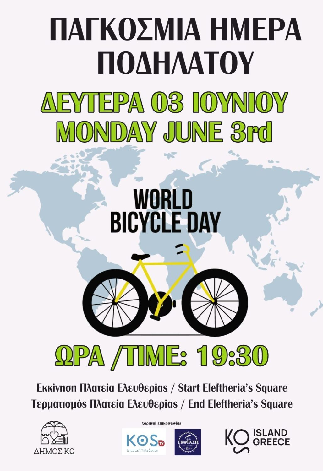 Παροτρύνουμε, λοιπόν, τους Συλλόγους του νησιού μας, Ποδηλατικούς και άλλους, καθώς και όλους τους συμπολίτες μας, αθλητές και μη, να συμμετέχουμε, τη Δευτέρα, 3 Ιουνίου 2024, και ώρα 19:30, στον εορτασμό αυτής της Παγκόσμιας Ημέρας Ποδηλάτου στο νησί της Κω, ακολουθώντας μια όμορφη ποδηλατική πορεία!!