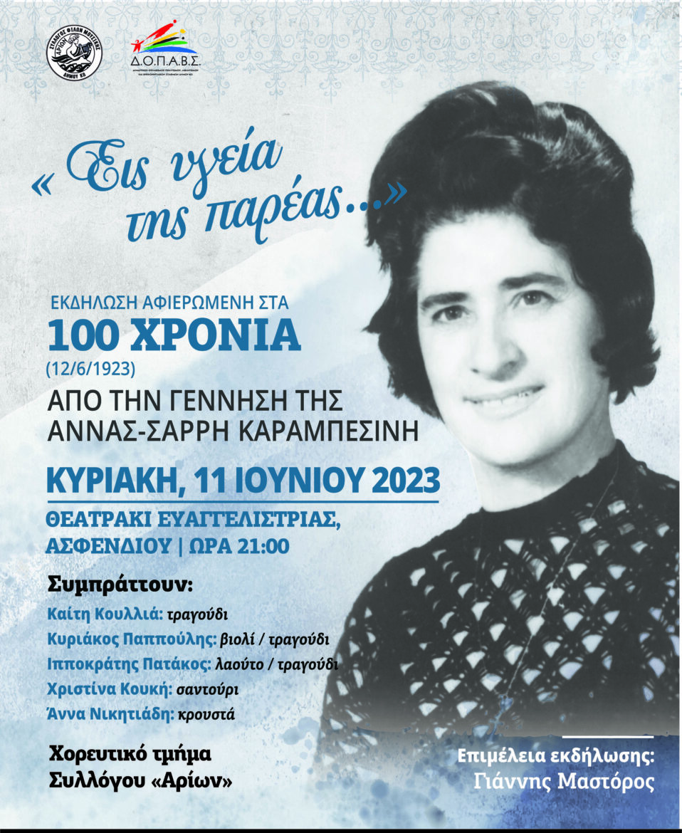 Στις 11 Ιουνίου συμπληρώνονται 100 χρόνια από την γέννηση της αγαπημένης μας ΑΝΝΑΣ ΣΑΡΡΗ-ΚΑΡΑΜΠΕΣΙΝΗ.