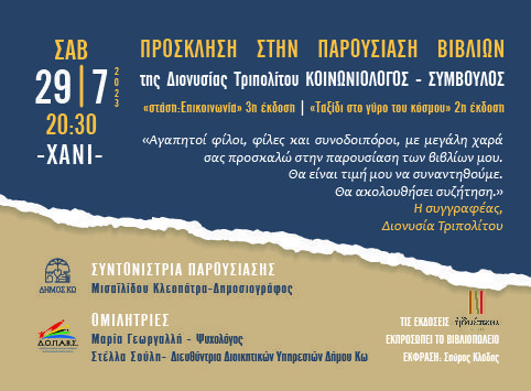Εκδήλωση για την παρουσίαση των βιβλίων της κοινωνιολόγου και συμβούλου Διονυσίας Τριπολίτου με τίτλο ‘’ στάση: Επικοινωνία’’ 3η έκδοση και ‘’ Ταξίδι στο γύρο του κόσμου’’ 2η έκδοση διοργανώνουν ο ΔΟΠΑΒΣ , οι Εκδόσεις Ηδυέπεια και το Βιβλιοπωλείο Έκφραση στα Θερινά Ιπποκράτεια 2023 το Σάββατο 29 Ιουλίου στις 8.30 το βράδυ στο Ιστορικό και Λαογραφικό Μουσείο Κω ( Χάνι ).