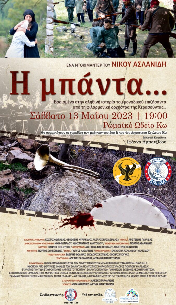 Η προβολή του βραβευμένου ντοκιμαντέρ του Νίκου Ασλανίδη (Δημοσιογράφου της ΕΡΤ) με τίτλο , ” Η Μπάντα” και η χορωδία των παιδιών του 2ου και του 4ου Δημοτικού Σχολείου (υπό την καθοδήγηση της καθηγήτριας μουσικής Αμπατζίδου Ιωάννας) θα μας ταξιδέψουν πίσω στον Πόντο , θα μας θυμίσουν το μαρτύριο των Γενοκτονημένων και των Ξεριζωμένων προγόνων μας.