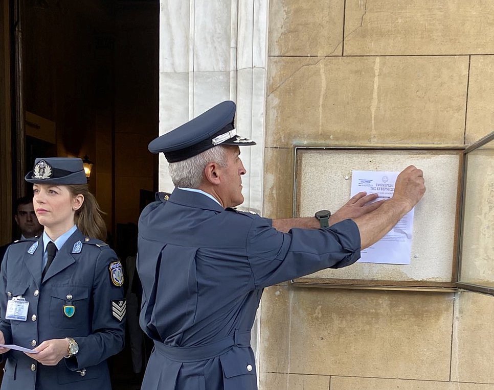 Λίγα μόνο λεπτά μετά την ανακοίνωση των αποτελεσμάτων της εκλογής Προεδρείου της Βουλής θυροκολλήθηκε από τον φρούραρχο της Βουλής Ταξίαρχο Φώτη Ντουίτση το προεδρικό διάταγμα διάλυσης της Βουλής.