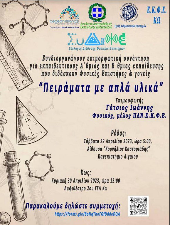Η Περιφέρεια Νοτίου Αιγαίου, η Διεύθυνση Δευτεροβάθμιας Εκπαίδευσης Δωδεκανήσου, η Σχολή Ανθρωπιστικών Σπουδών του Πανεπιστημίου Αιγαίου, το Ε.Κ.Φ.Ε. Κω και ο Σύλλογος Διάδοσης Φυσικών Επιστημών, συνδιοργανώνουν επιμορφωτική συνάντηση για εκπαιδευτικούς Α΄θμιας και Β΄θμιας εκπαίδευσης που διδάσκουν Φυσικές Επιστήμες, φοιτητές και γονείς με θέμα: