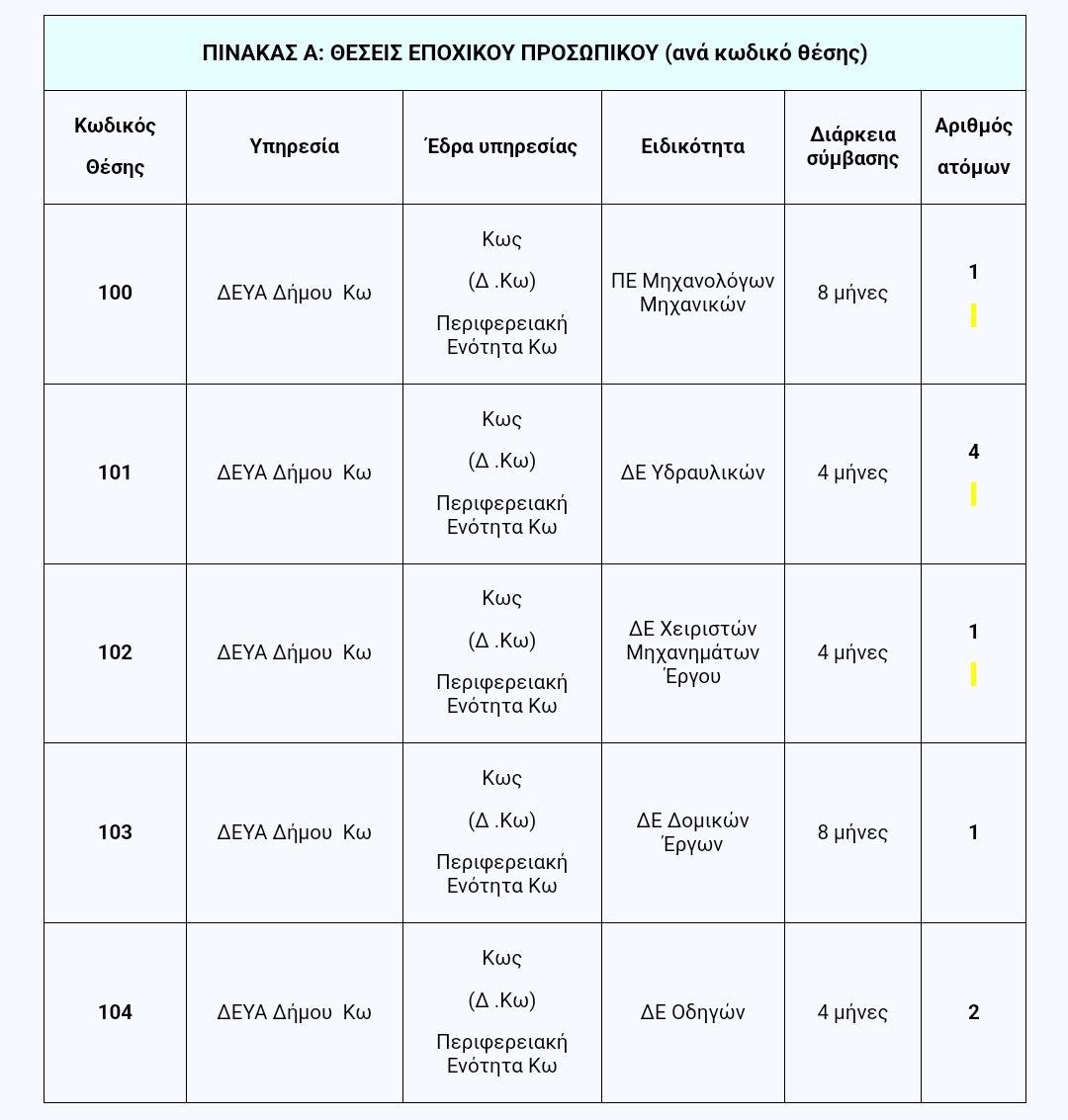 Η ΔΕΥΑ Δήμου Κω πρόκειται να προσλάβει προσωπικό με σύμβαση εργασίας Ιδ. Δικαίου ορισμένου χρόνου συνολικού αριθμού εννέα (9) ατόμων στις εξής θέσεις: