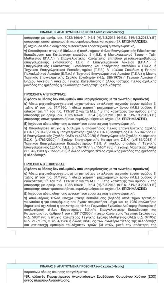 α) Πτυχίο ή δίπλωμα ή απολυτήριος τίτλος ειδικότητας Μηχανών και Συστημάτων Αυτοκινήτου ή Μηχανών Αυτοκινήτου ή Μηχανοτεχνίτη Αυτοκινήτου ή Ηλεκτρολογικών Συστημάτων Αυτοκινήτου ή Τεχνίτης Ηλεκτρολόγος Αυτοκινήτων Οχημάτων ή Τεχνιτών Ηλεκτρολογικών Συστημάτων Αυτοκινήτων ή Ηλεκτρικού Συστήματος Αυτοκινήτου ή Ηλεκτροτεχνίτη Αυτοκινήτου ή Τεχνιτών Ηλεκτρολογικών Συστημάτων Αυτοκινήτων ή Τεχνιτών Μηχανών και Συστημάτων Αυτοκινήτου ή Τεχνίτης Μηχανικός αυτοκινήτων μοτοσικλετών και μηχανών θαλάσσης Επαγγελματικής Σχολής (ΕΠΑ.Σ.) ν.3475/2006 ή Επαγγελματικής Σχολής (ΕΠΑ.Σ.) Μαθητείας ΟΑΕΔ ν.3475/2006 ή Επαγγελματικής Σχολής ΟΑΕΔ (ν.4763/2020) ή Επαγγελματικής Σχολής Κατάρτισης Ε.Σ.Κ. (ν.4763/2020) ή Σχολής Επαγγελματικής Κατάρτισης Σ.Ε.Κ. (ν.4186/2013) ή Τεχνικού Επαγγελματικού Εκπαιδευτηρίου Τ.Ε.Ε. Α΄ κύκλου σπουδών ή Τεχνικής Επαγγελματικής Σχολής Τ.Ε.Σ. (ν.576/1977 ή ν.1566/1985 ή) ή Σχολής Μαθητείας ΟΑΕΔ (ν.1346/1983 ή ν.1566/1985) ή άλλος ισότιμος τίτλος σχολικής μονάδας της ημεδαπής ή αλλοδαπής*, αντίστοιχης ειδικότητας,