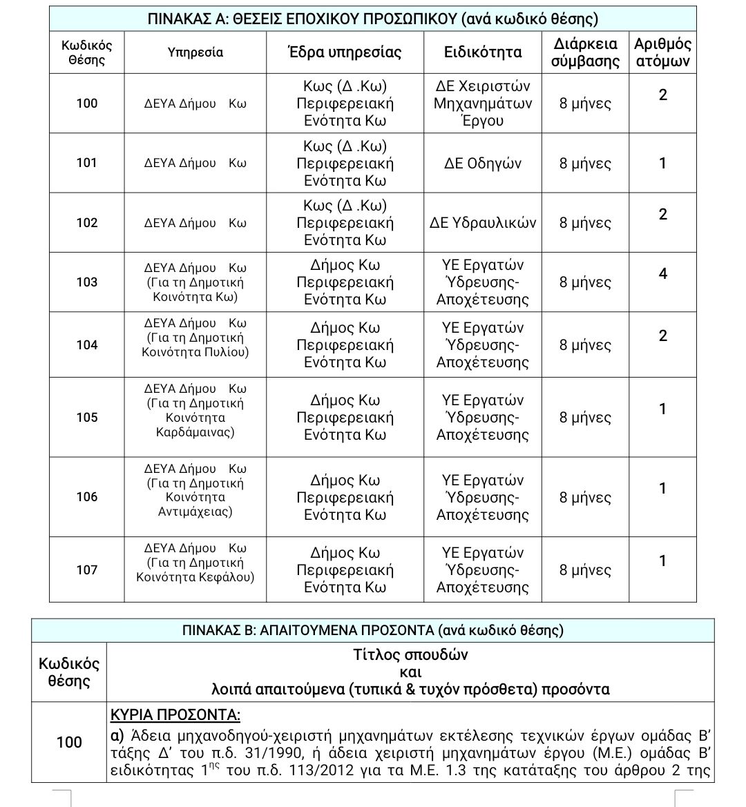 Η ΔΕΥΑ Δήμου Κω πρόκειται να προσλάβει προσωπικό με σύμβαση εργασίας Ιδ. Δικαίου ορισμένου χρόνου συνολικού αριθμού δεκατεσσάρων (14) ατόμων στις εξής θέσεις: