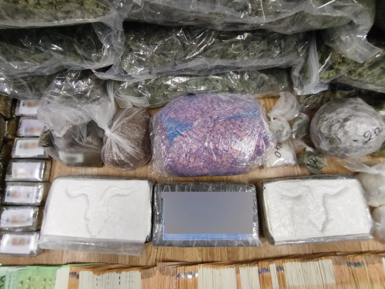 Σε έρευνες που πραγματοποιήθηκαν σε δύο σπίτια, σε όχημα, καθώς και στην κατοχή των συλληφθέντων, βρέθηκαν και κατασχέθηκαν: 4 κιλά και 51 γραμμάρια κοκαΐνης, 49 κιλά και 478 γραμμάρια ακατέργαστης κάνναβης υδροπονικής καλλιέργειας (skunk), 9 κιλά και 309 γραμμάρια κατεργασμένης κάνναβης, 635 γραμμάρια κρυσταλλικής μεθαμφεταμίνης, 6.500 δισκία Εcstasy, 1,2 γραμμάρια ακατέργαστης κάνναβης, 58.000 ευρώ, 2 οχήματα, 3 ηλεκτρονικές ζυγαριές ακριβείας, 5 κινητά τηλέφωνα και πλήθος νάιλον συσκευασιών.