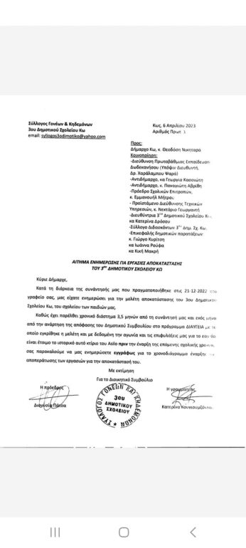 Καθώς ακόμα δεν έχουν αρχίσει οι εργασίες αποκατάστασης του 3ου Δημοτικού Σχολείου Κω, αποστειλαμε νέα επιστολή στη δημοτική αρχή, την οποία παραθέτουμε για ενημέρωση του συνόλου των γονεων.