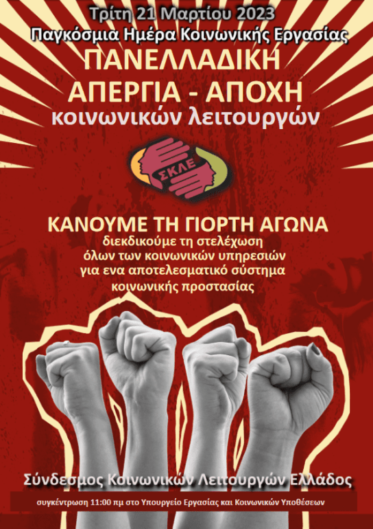 Το Εργατοϋπαλληλικό Κέντρο Βορείου Συγκροτήματος Δωδεκανήσου στηρίζει την απεργιακή κινητοποίηση του Συνδέσμου Κοινωνικών Λειτουργών Ελλάδας, και με ομόφωνη απόφαση του Διοικητικού Συμβουλίου, σε συνεδρίασή του της 17ης Μαρτίου 2023, ημέρα Παρασκευή, αποφασίζει να κηρύξει 24ωρη απεργία αρχομένης ώρας 00:01, Τρίτη 21 Μαρτίου 2023, και λήγουσας 24:00, Τρίτη 21 Μαρτίου 2023, στις επιχειρήσεις και στους οργανισμούς που απασχολούν εργαζόμενους παρέχοντες εργασία κοινωνικού λειτουργού με σύμβαση ιδιωτικού δικαίου, με αιτήματα:
