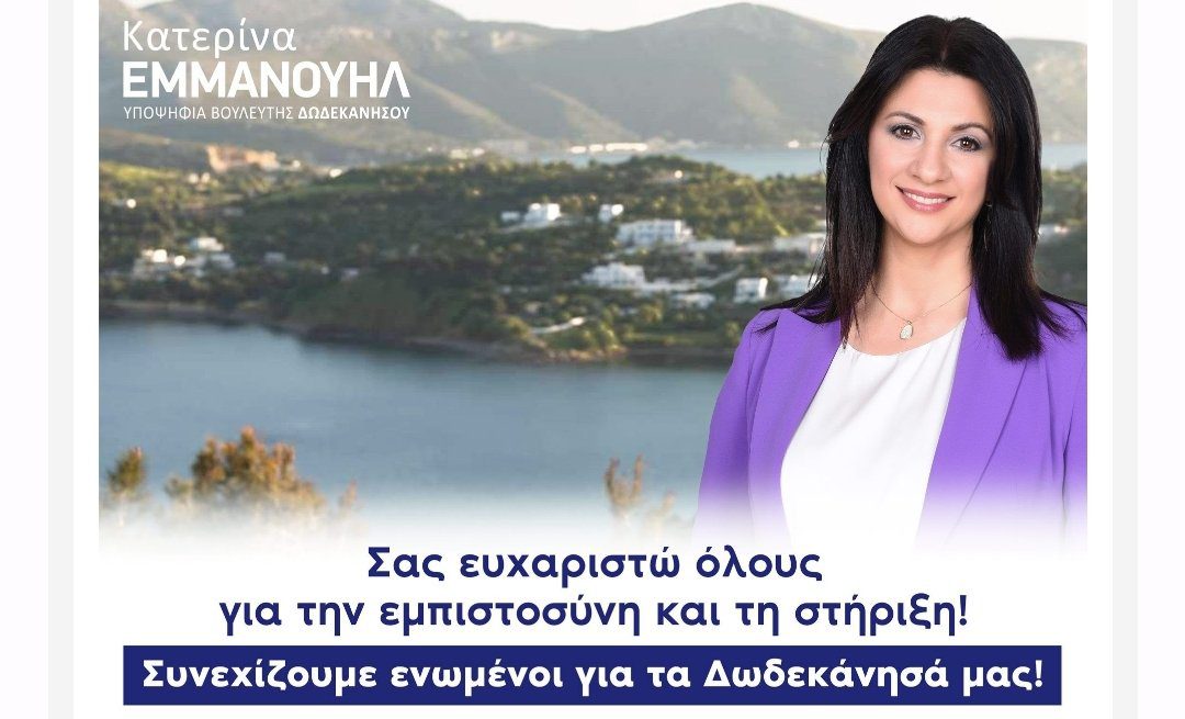 Ένα τεράστιο ευχαριστώ από καρδιάς για την εμπιστοσύνη που δείξατε στη μεγάλη δημοκρατική παράταξη της ΝΕΑΣ ΔΗΜΟΚΡΑΤΙΑΣ και τον Κυριάκο Μητσοτάκη, αλλά κυρίως σε όλους εσάς, που πιστέψατε σε μένα, ακούσατε τις απόψεις μου και με στηρίξατε με την ψήφο σας, σε αυτή την πρώτη μου προσπάθεια στην κεντρική πολιτική σκηνή. Είναι πολύ μεγάλη η χαρά μου, που συμμετείχα σε αυτό το πολύ δυνατό για τα Δωδεκάνησα, ψηφοδέλτιο βάζοντας και εγώ το λιθαράκι μου στη μεγάλη νίκη της παράταξής μας.