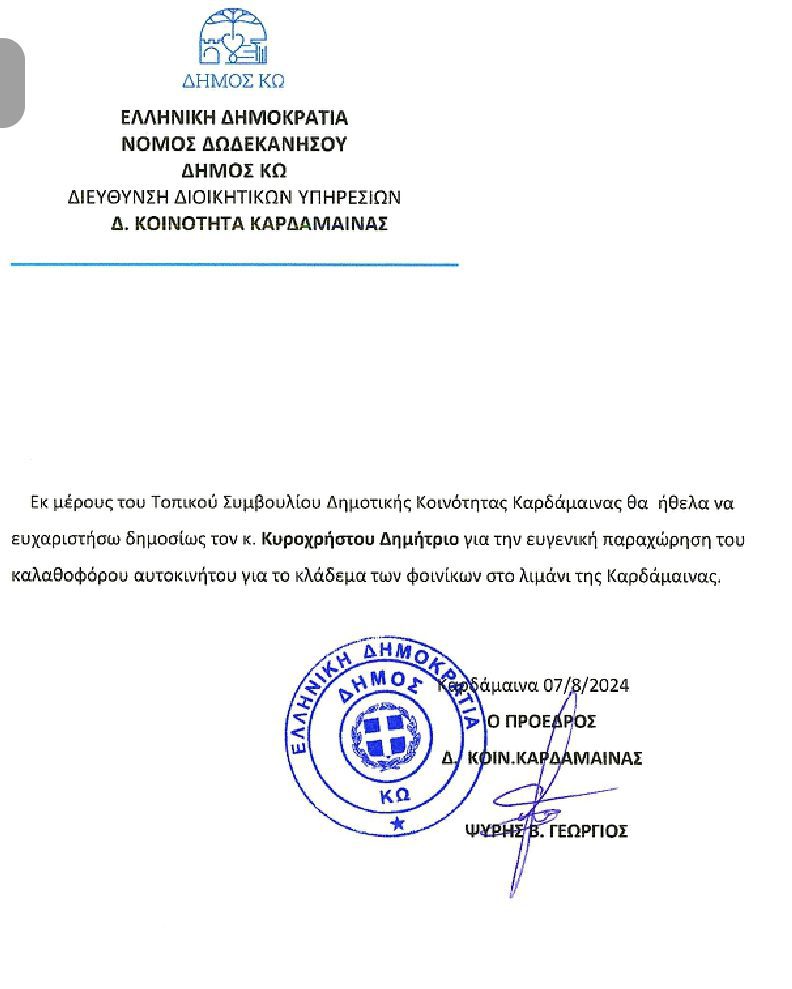 Ευχαριστήρια επιστολή της Δημοτικής Κοινότητας Καρδάμαινας στον Δημήτρη Κυροχρήστο